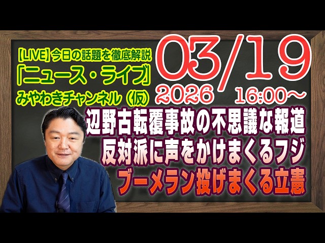 【LIVE】辺野古の転覆事故の不可思議な報道。反対派に声をかけまくるフジテレビ。ブーメランを投げまくる立憲|メルマガ「予定未定」「みやチャン・ニュース・ライブ」(令和8年03月19日 16:00分〜)
