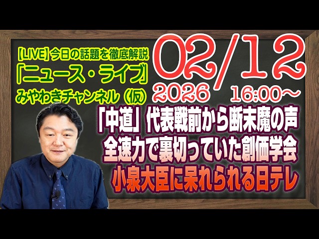 【LIVE】「中道」代表戦の前から断末魔の声。全速力で裏切っていた創価学会。小泉大臣に呆れられる日テレ|メルマガ「チーみら解説」「みやチャン・ニュース・ライブ」(令和8年02月12日 16:00分〜)