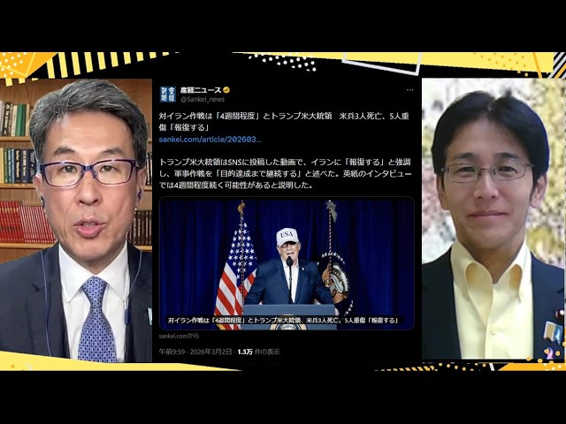 【トランプ大統領】大規模攻撃間もなく/イラン情勢と偏向メディア/小野田大臣 伊藤穣一氏への聞き取り検討を指示/外国人問題 3/3(火)21:50-22:45一般『発見!Twitter探偵団』長尾×吉田