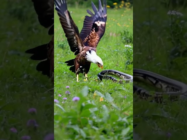 A giant python with long fangs tries to attack and wraps itself around an eagle's neck in the desert