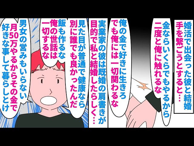 【漫画】夫「既婚者ってだけで社会的に有利なんだよw」婚活で知り合った実業家のイケメン彼とスピード婚→既婚の肩書きが欲しかっただけの彼は月50万渡す代わりに干渉するなと言い(スカッと漫画)【マンガ動画】