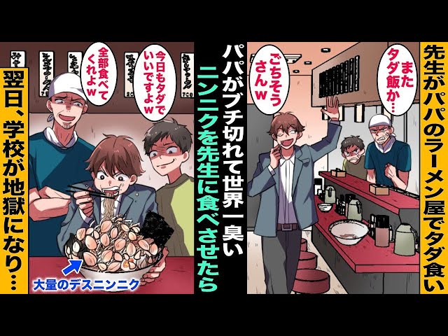 【漫画】先生がパパのラーメン屋に毎日来て代金を払わずにタダで食べて帰っていくのでパパが遂にブチ切れ…ラーメンに世界一臭いデスニンニクを大量に入れて出したら先生は完食したが翌日、学校が先生の臭いで・・・