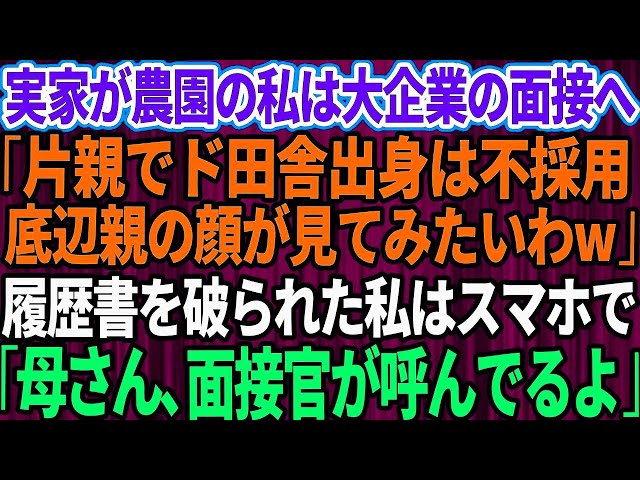 【スカッとする話】憧れの大企業の面接に行くと実家が農家の私を見下す面接官「ド田舎出身は不採用!こんな底辺採用する人がいたら逆に教えてくれw」私「わかりました」→直後、スマホを出し「母さん、面接官が呼ん