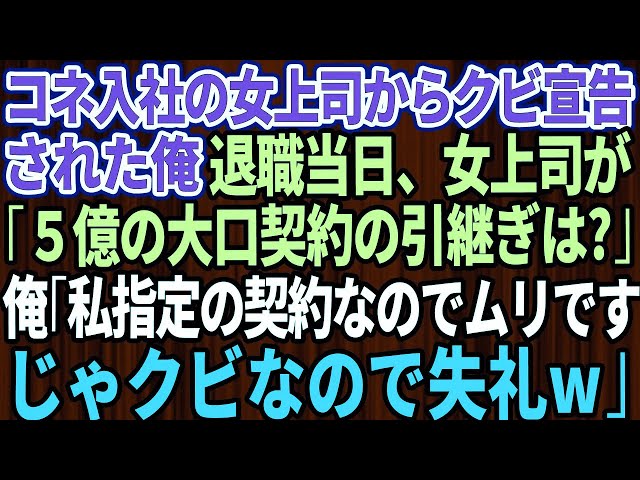【スカッとする話】コネ入社の無能な女上司「役立たずの無能はクビw」→退職当日、女上司「5億円の大口契約ちゃんと引き継いでね!」俺「俺指名の契約なので無理ですね。じゃクビなので失礼しますw」上司「え?」