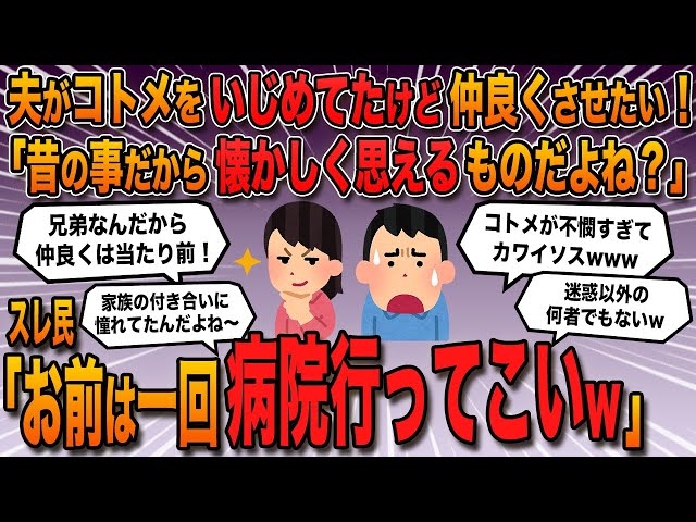 【報告者バカ】「夫とコトメの関係が希薄だから仲良くさせたい。過去に九州男児の夫がコトメをいじめてたらしいけど、時間が経ったら懐かしく思えるよね?」→スレ民「お前は一回病院行ってこいw」【2ch修羅場】