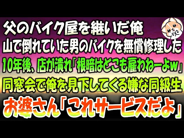 【感動する話】高齢の父が営む貧乏バイク屋を継いだ俺。ある日山道で傷だらけの男のバイクを無償修理した→10年後、同窓会で「お前みたいな根暗どこも雇わねーよw」と見下す同級生…お婆さん「これサービスだよ」